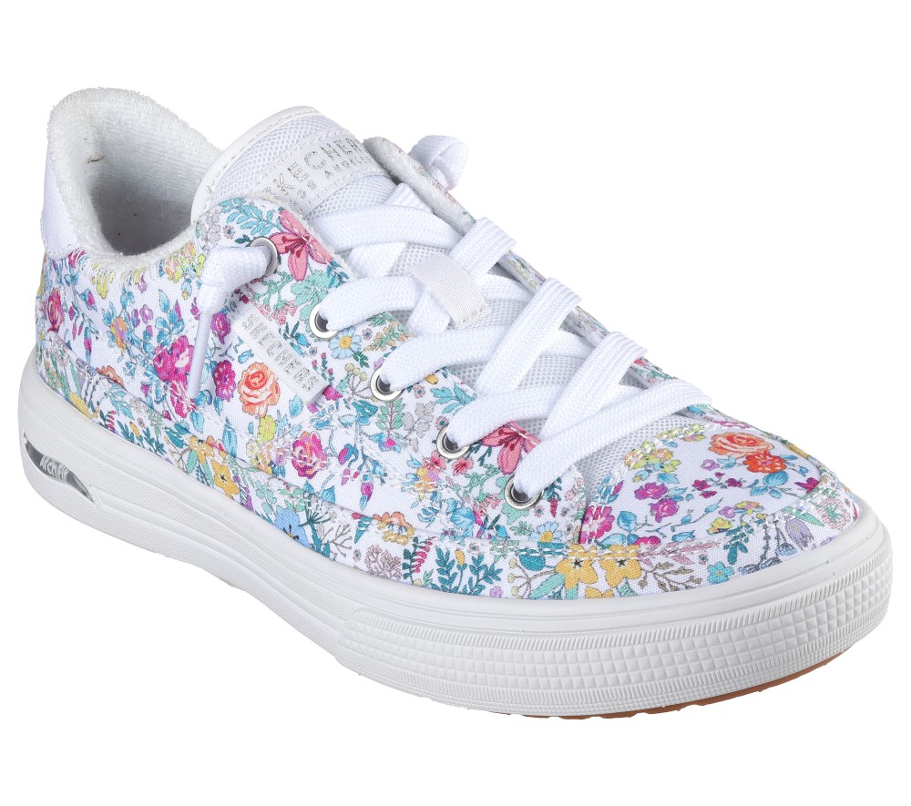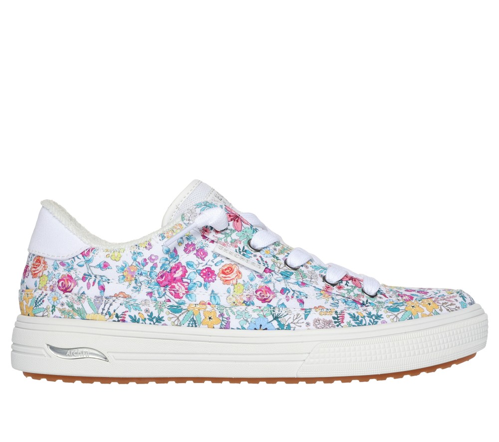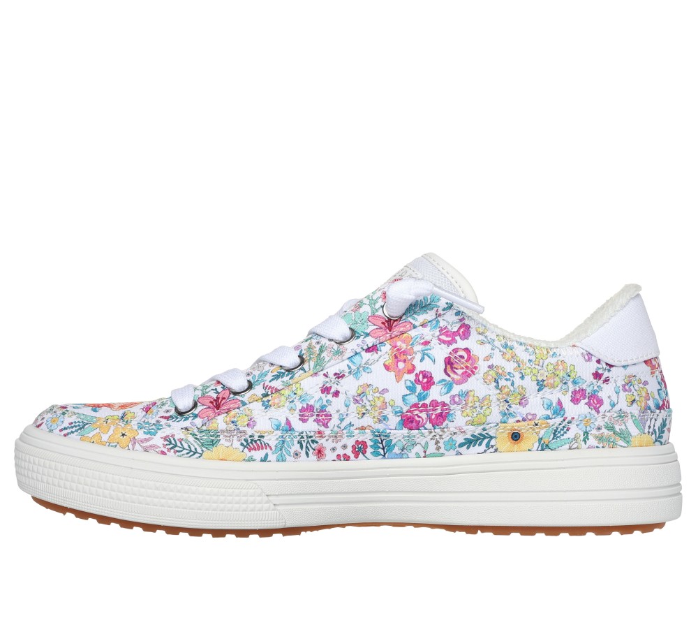 Crafted with 100% vegan materials. This Skechers shoe fresh floral design has been granted the APMA Seal of Acceptance and features a canvas upper with decorative tied-off laces, a removable Arch Fit® insole, and a lightweight cushioned midsole. Our Arch Fit® technology features a removable, supportive cushioning insole system for a more comfortable walking experience. These are Skechers Slip-Ons made by Skechers.