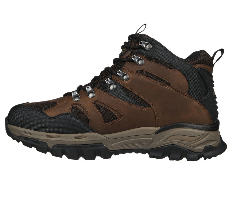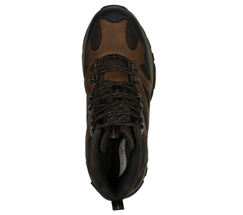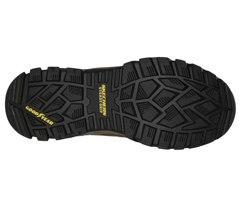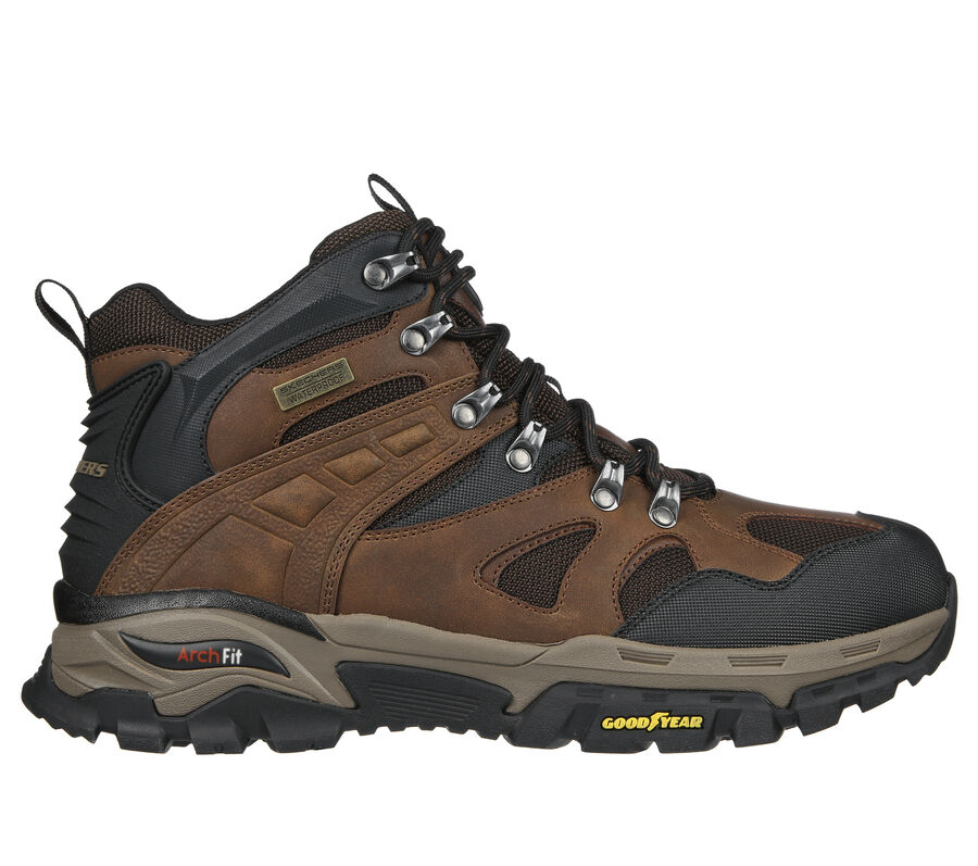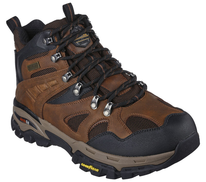 Leather, synthetic and mesh upper with lace-up front. This Skechers waterproof trail boot features a lace-up leather, synthetic and mesh upper with a removable Arch Fit® insole and Goodyear® Rubber Outsole. Our Arch Fit® technology features a removable, supportive cushioning insole system for a more comfortable walking experience. These are Waterproof Shoes made by Skechers.