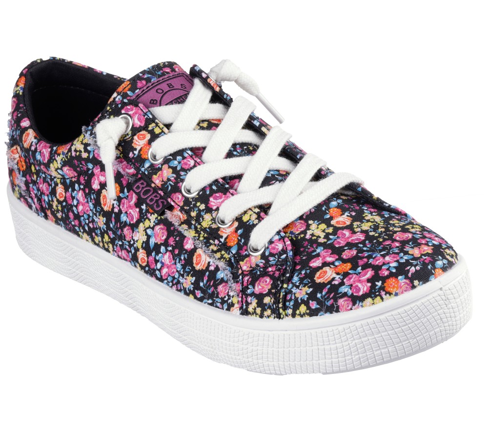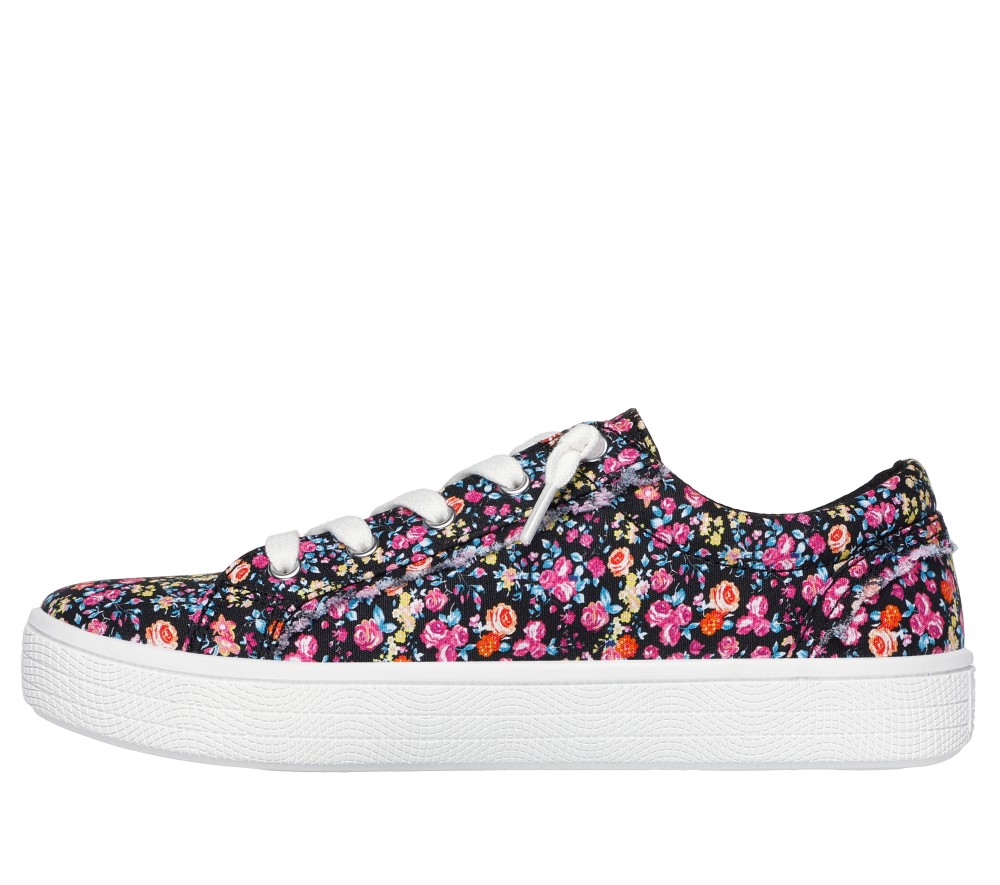 Canvas upper with allover multi-floral print. 1-inch heel height! This Skechers shoe vegan sneaker features a cotton canvas upper with an allover multi-floral print, tied-off decorative laces, and a cushioned Skechers Memory Foam™ insole. Light and so very comfortable. These are Canvas Shoes made by Skechers.