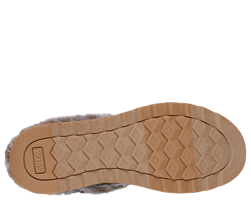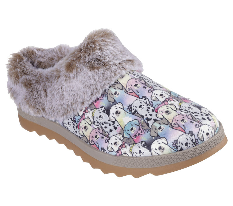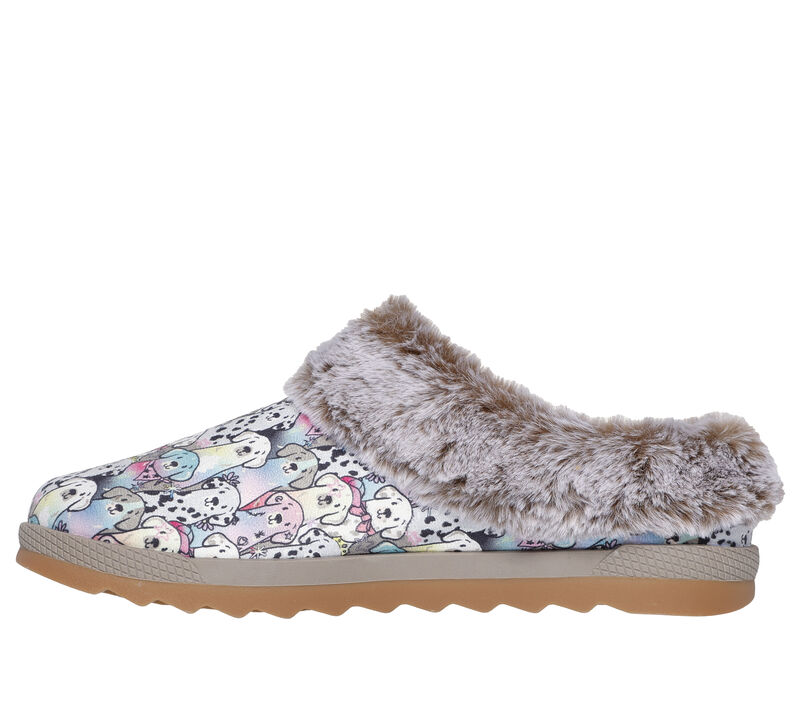 This Skechers shoe vegan clog-style slipper features a soft microfiber upper with an allover ‘Spotting Buddy’ puppy print, faux-fur trim and lining, and a cushioned Skechers Memory Foam™ insole. For every BOBS® purchase, a donation is made to animals in need. These are Slippers made by Skechers.