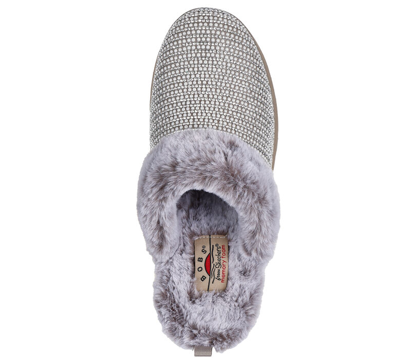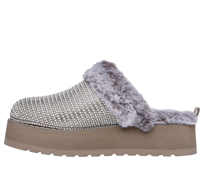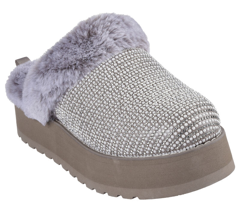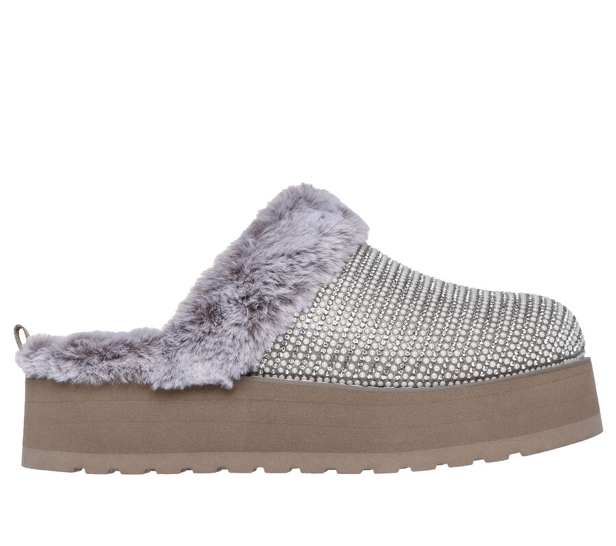 This Skechers shoe vegan clog-style platform slipper features a rhinestone and pearl embellished upper with faux-fur collar and lining, plus a cushioned Skechers Memory Foam™ footbed. For every BOBS® purchase, a donation is made to animals in need. These are Slippers made by Skechers.