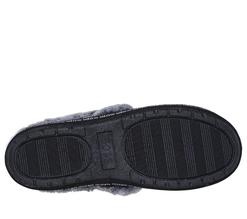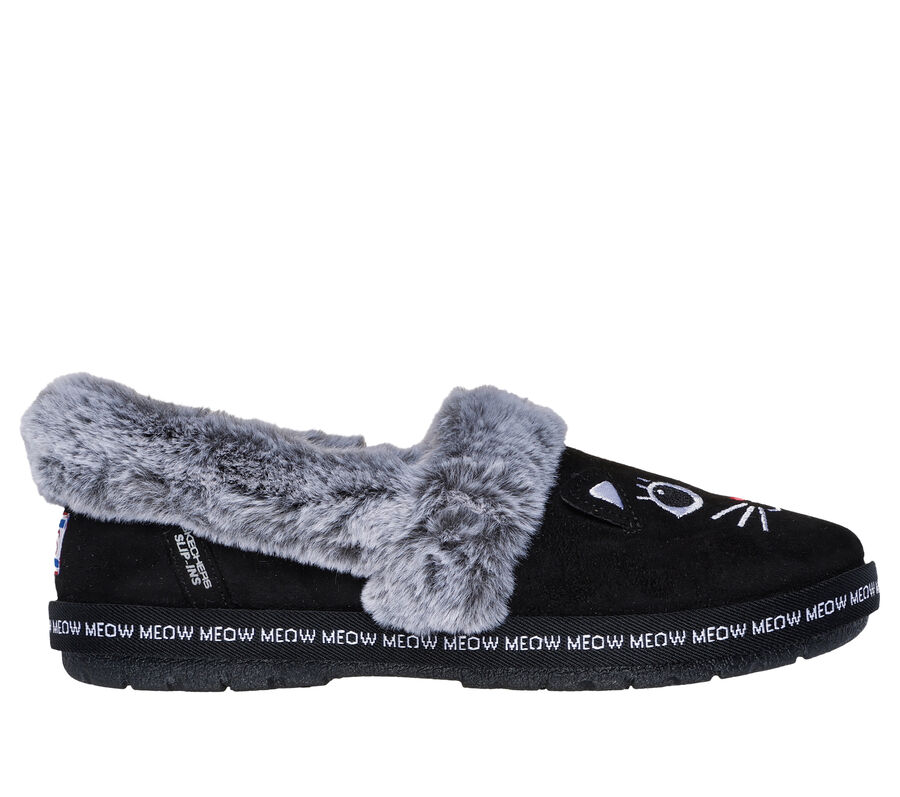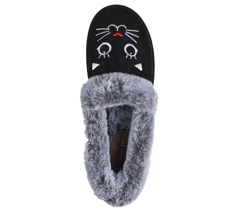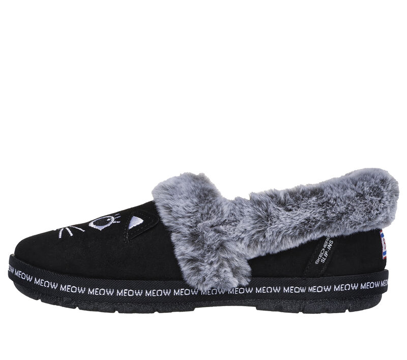This Skechers Slip-ins casual slipper features a vegan suede upper with an embroidered 3-D Black Cat face design, faux-fur trim, and a cushioned Skechers Memory Foam™ footbed. For every BOBS® purchase, a donation is made to animals in need. These are Slippers made by Skechers.