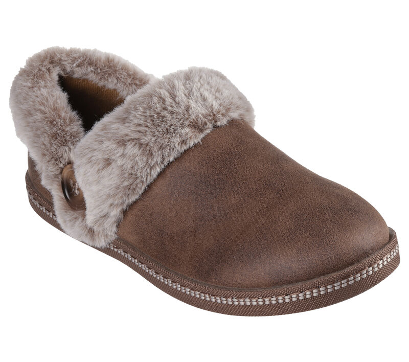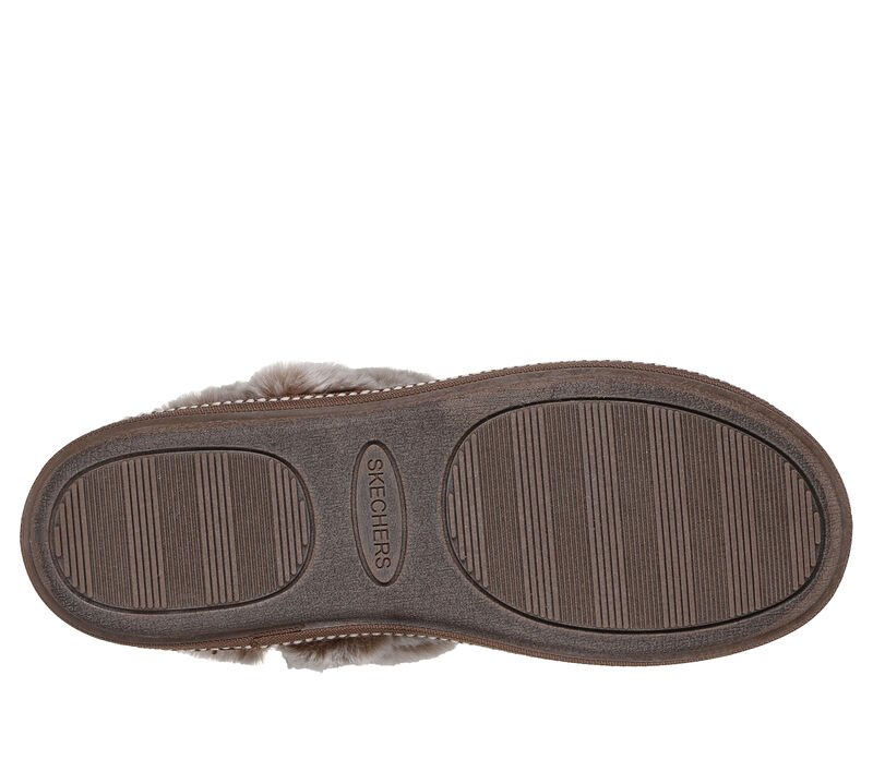 This Skechers casual comfort slipper features a vegan leather upper with faux-fur trim and a cushioned Skechers Memory Foam™ comfort footbed. These are Slippers made by Skechers.