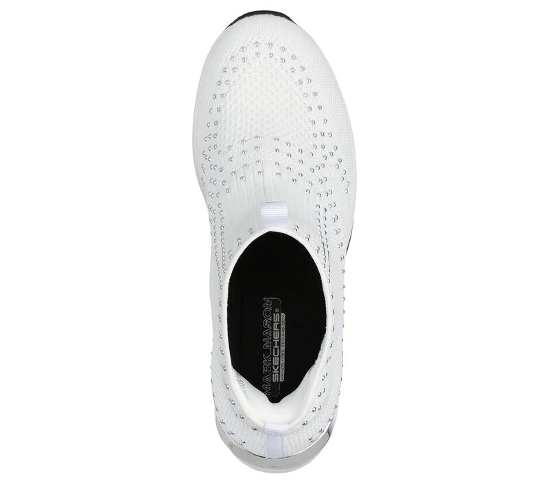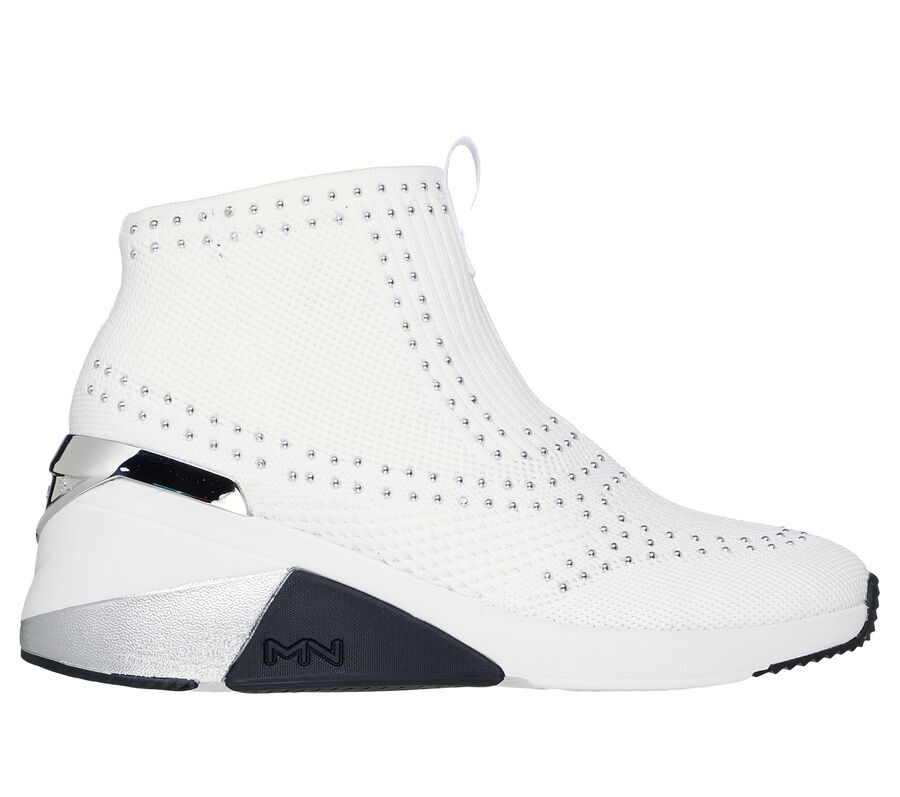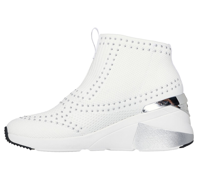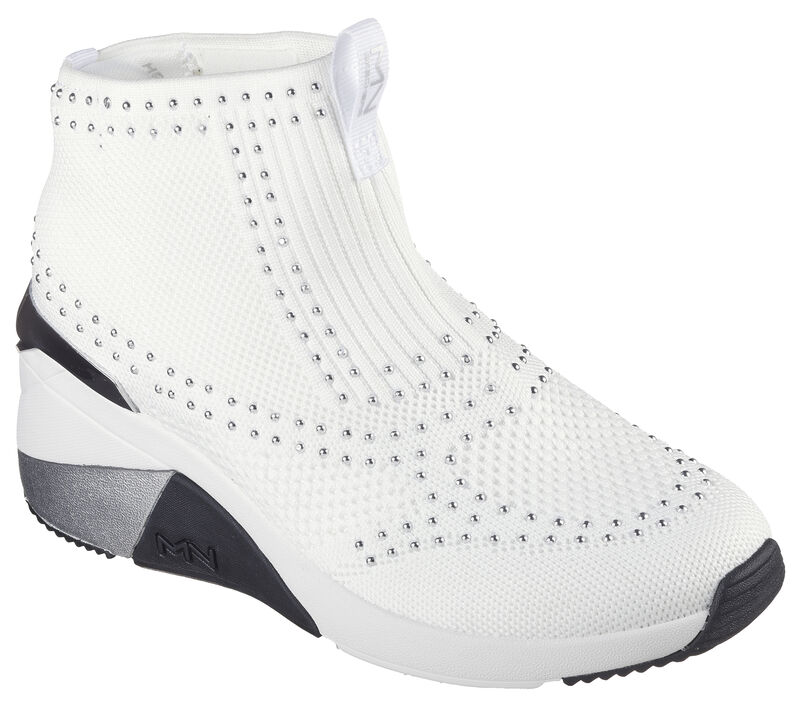 Sleek, shine-studded knit upper. This Skechers trendy fashion ankle bootie features a sleek, shine-studded knit upper with a Memory Foam Lux comfort insole and colorblocked wedge midsole. Pull-on ankle bootie with a colorblocked wedge heel. These are Women’s Shoes made by Skechers.