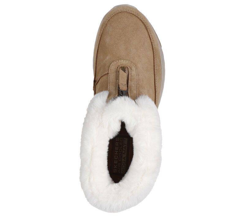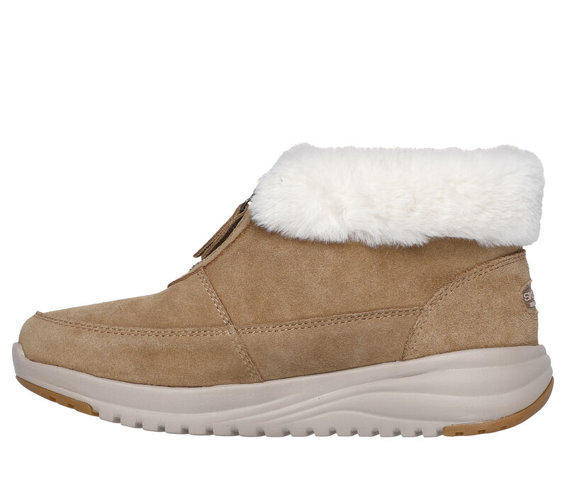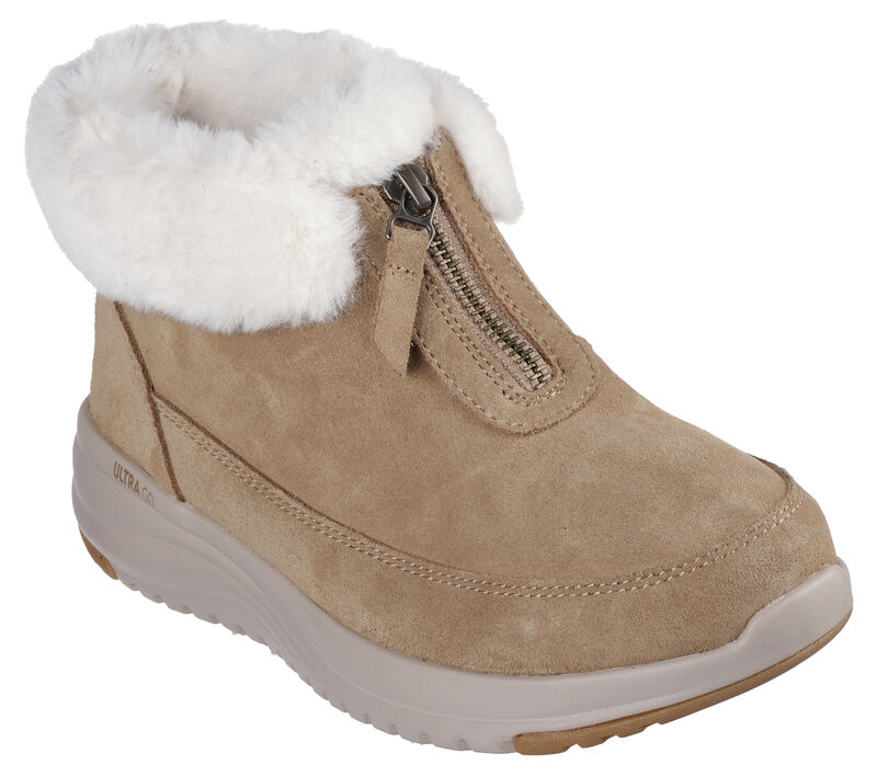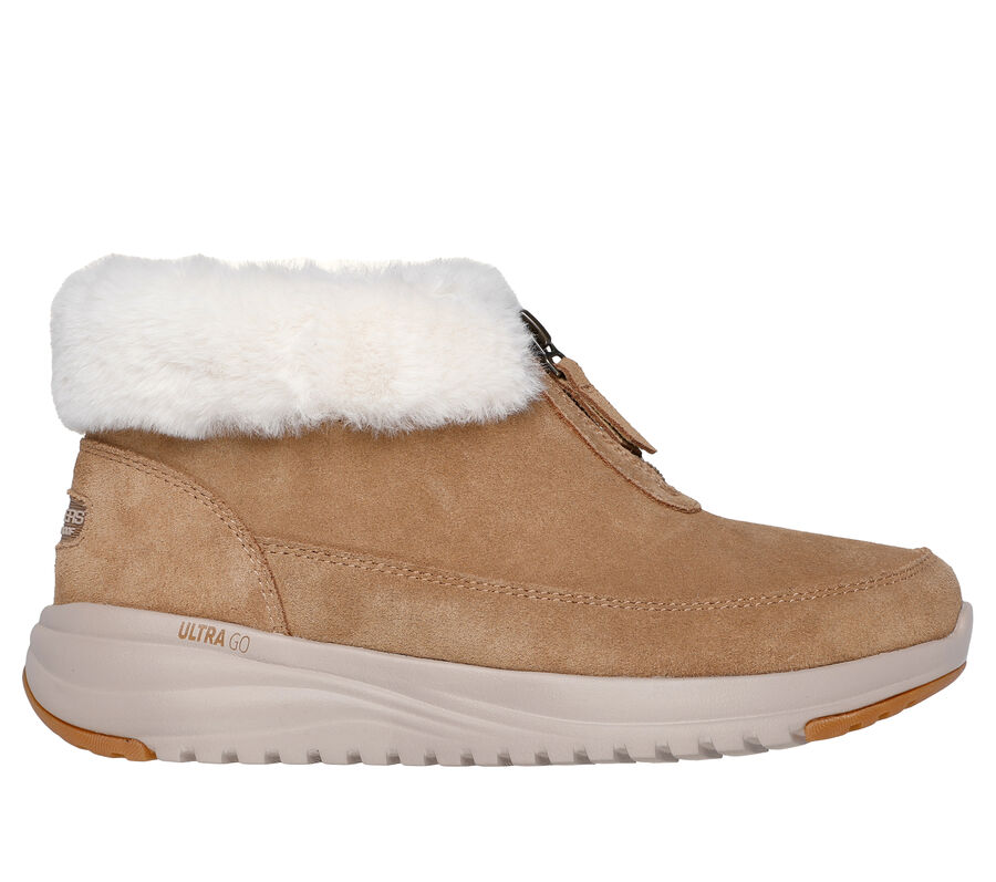 Suede upper with a faux-fur collar and lining. This Skechers waterproof zip-up boot features a suede upper with faux-fur collar and lining, lightweight ULTRA GO® cushioning, and a Skechers Air-Cooled Goga Mat™ insole. These are Waterproof Shoes made by Skechers.