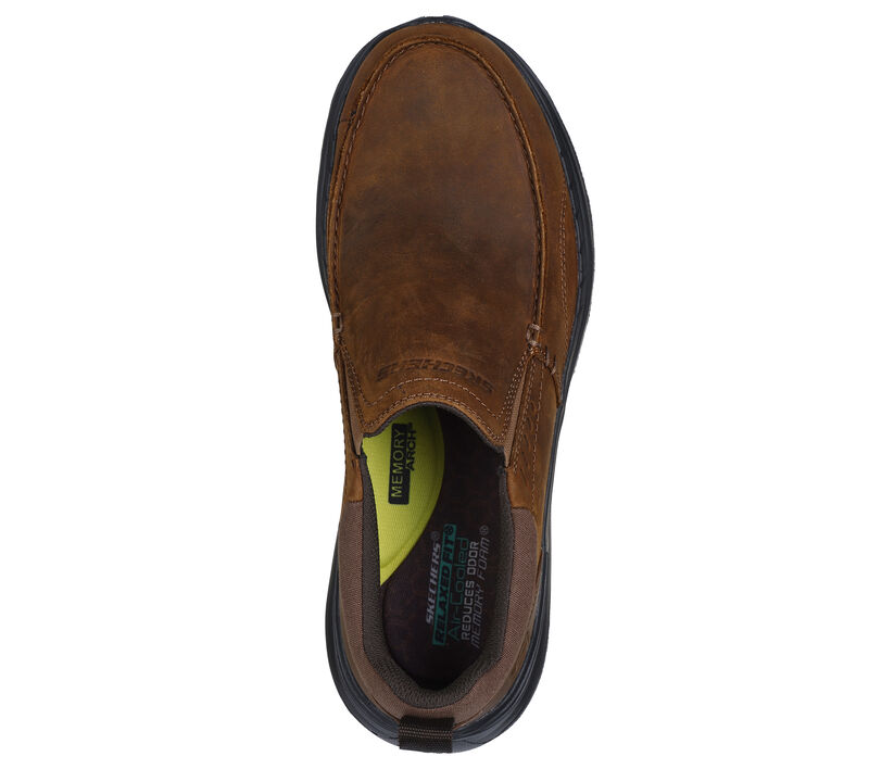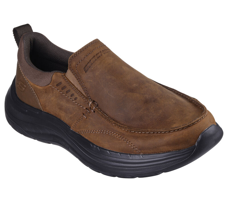 This Skechers shoe moc toe loafer features a leather upper with dual gore panels, a charcoal-infused Skechers Air-Cooled Memory Foam® insole, and Skechers Memory Arch™ cushioning for added support.