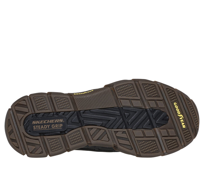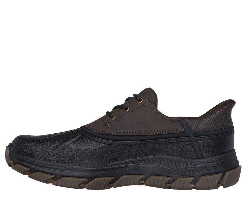 Designed with our exclusive Heel Pillow™, this Skechers waterproof duck style slip-on features a leather and synthetic upper with stretch laces, a Skechers Air-Cooled Memory Foam® insole, and an anti-slip Goodyear® Rubber Outsole. These are Skechers Casual Shoes made by Skechers.