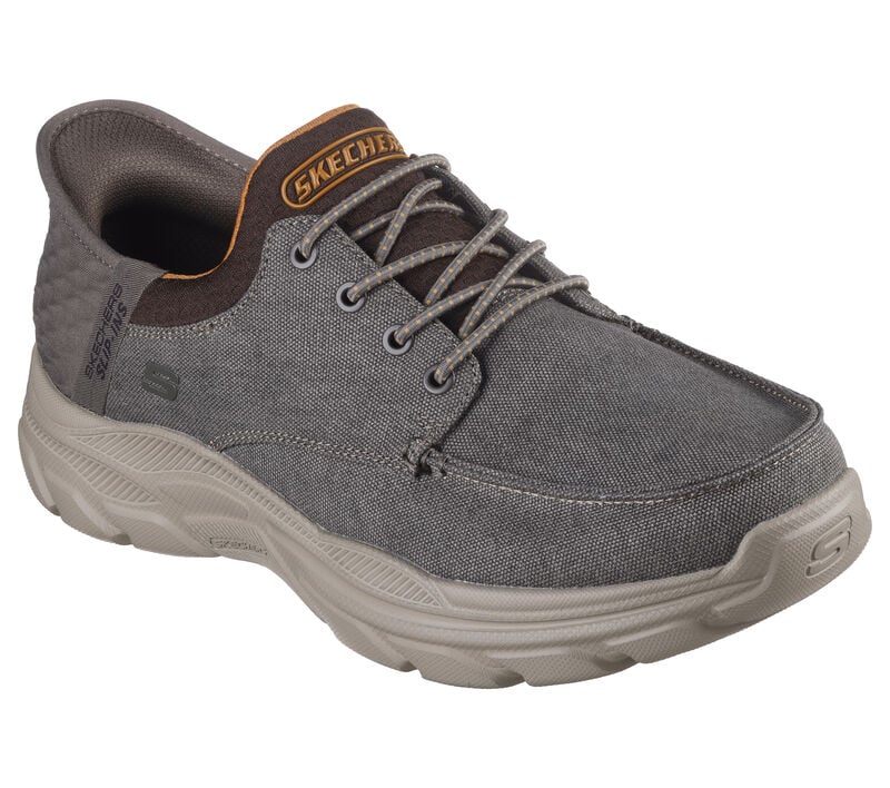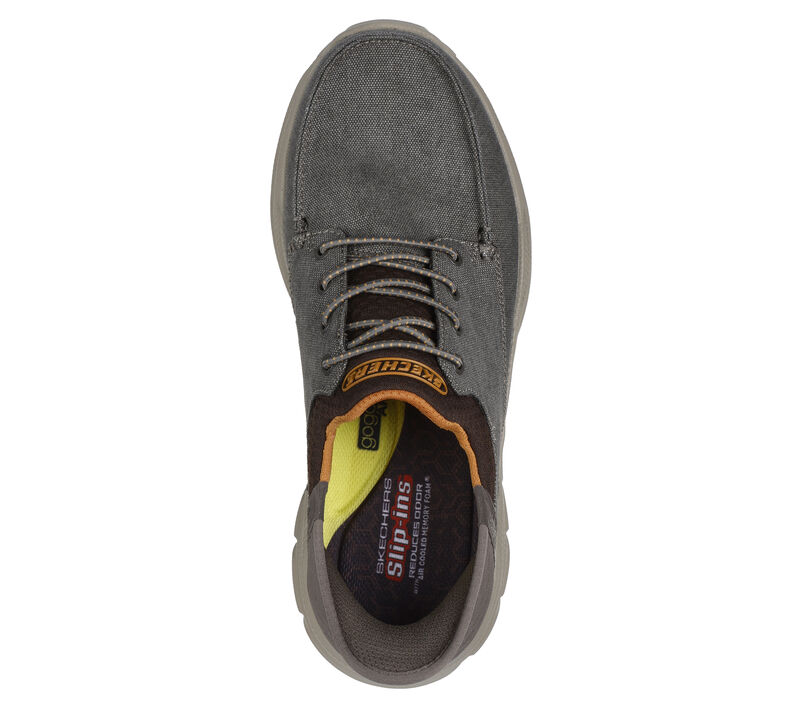 Designed with our exclusive Heel Pillow™, this Skechers vegan moc toe slip-on features a canvas upper with stretch laces, Goga Mat Arch™ technology, and a charcoal-infused Air-Cooled Memory Foam® insole. These are Canvas Shoes made by Skechers.
