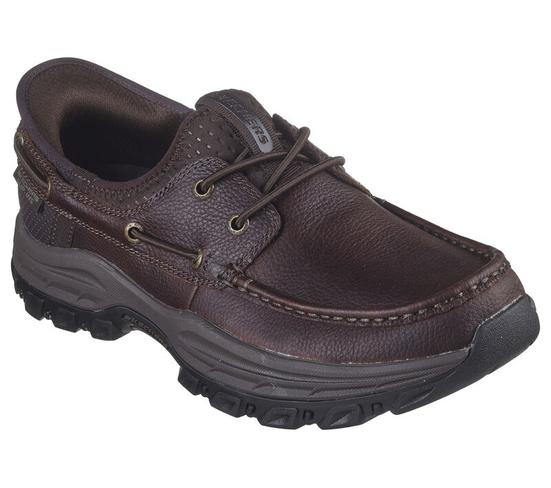 Bring classic style and comfort everywhere in Skechers Hands Free Slip-ins® Relaxed Fit. Designed with our exclusive Heel Pillow, this roomy moc toe slip-on features a leather upper with stretch lace accents, a hands-free molded heel panel, Goga Mat Arch cushioning, and a charcoal-infused Air-Cooled Memory Foam insole. These are Men’s Shoes made by Skechers.