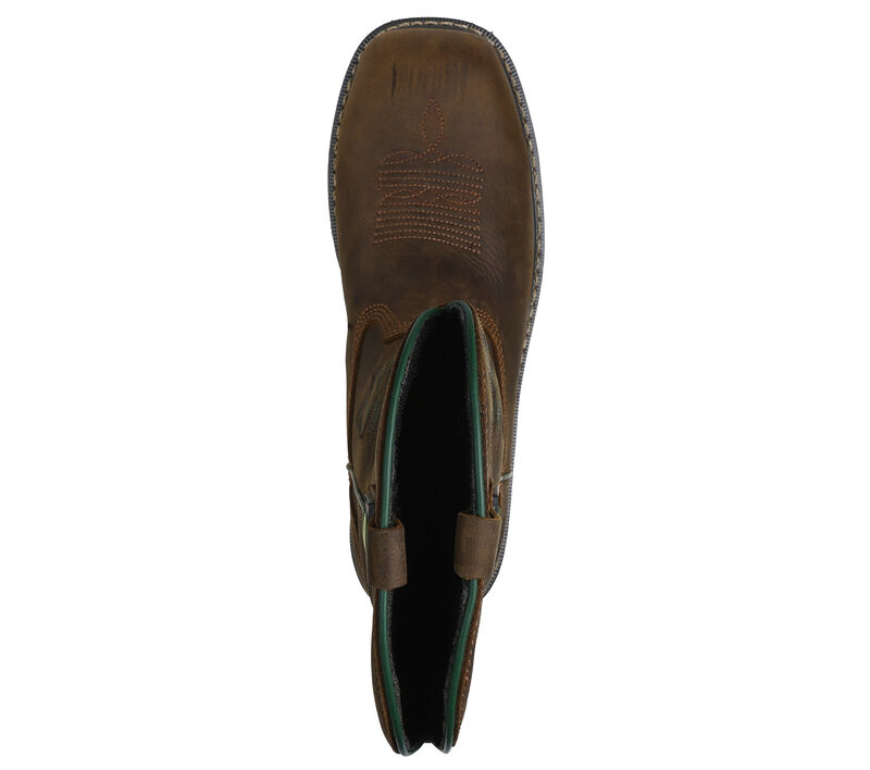 This Skechers John Deere pull-on work boot features a waterproof leather upper with deco stitching, Goodyear welt midsole and a composite safety toe. Fusing John Deere’s rich heritage with Skechers’ comfort technologies, this John Deere style delivers the perfect blend of style and durability for work, outdoors and the street. These are Skechers Boots made by Skechers.