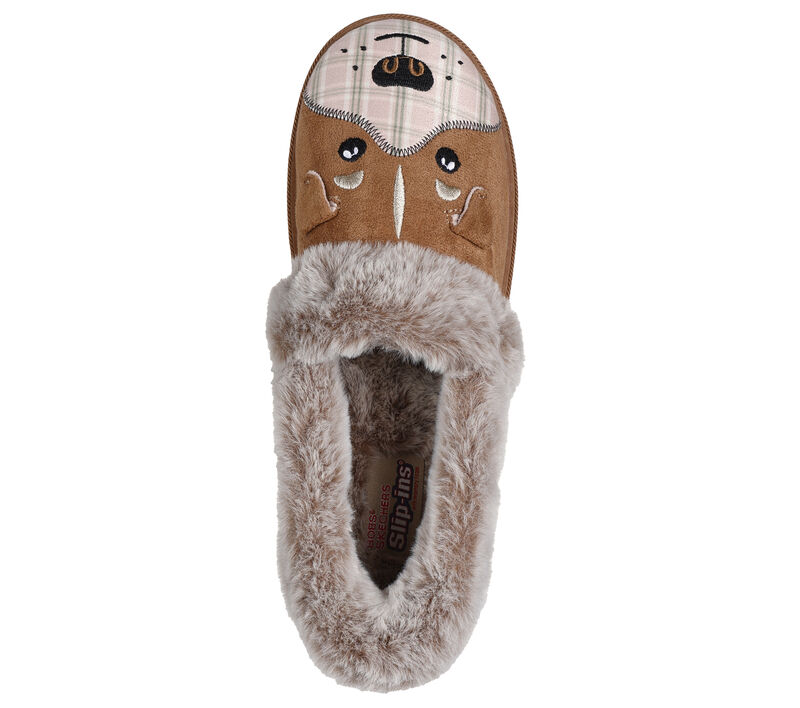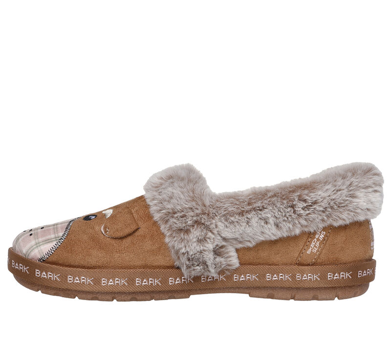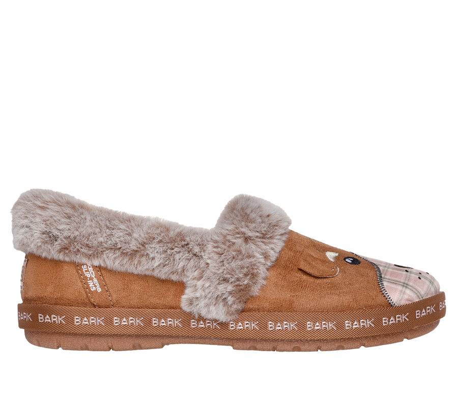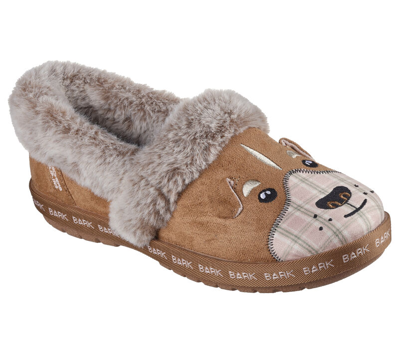 This Skechers shoe casual indoor/outdoor slipper features a woven fabric upper with an embroidered 3-D dog face design, faux-fur lining and trim, plus a cushioned Skechers Memory Foam footbed. For every BOBS® purchase, a donation is made to animals in need. SLIP IN to pure comfort and convenience with Skechers Hands Free Slip-ins®. Easy-wear shoes designed with our exclusive Heel Pillow™ that holds your foot securely in place. These are Slippers made by Skechers.