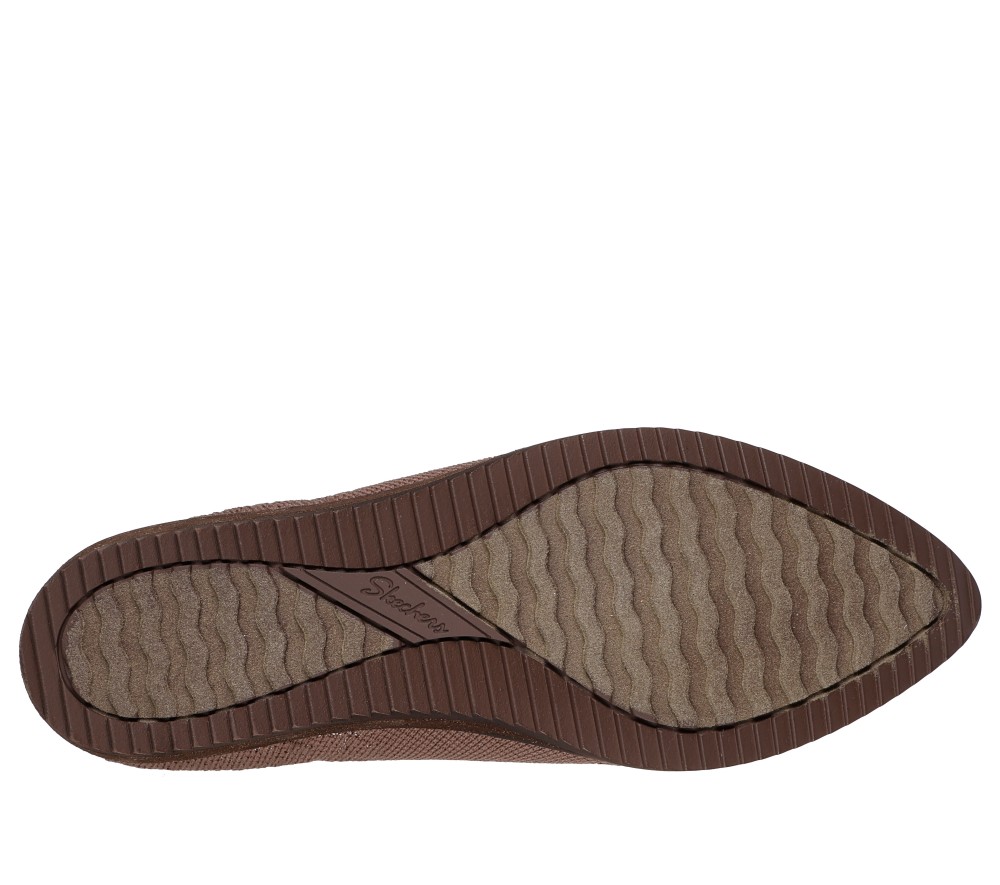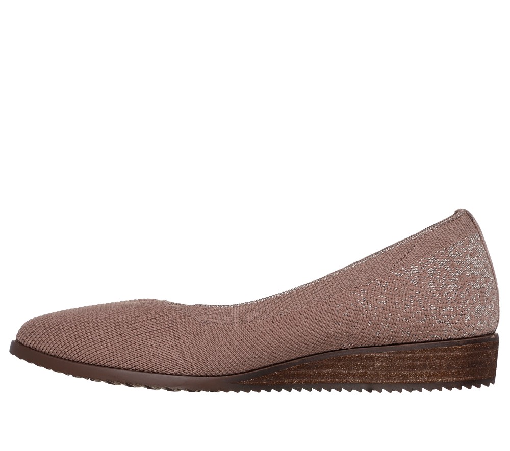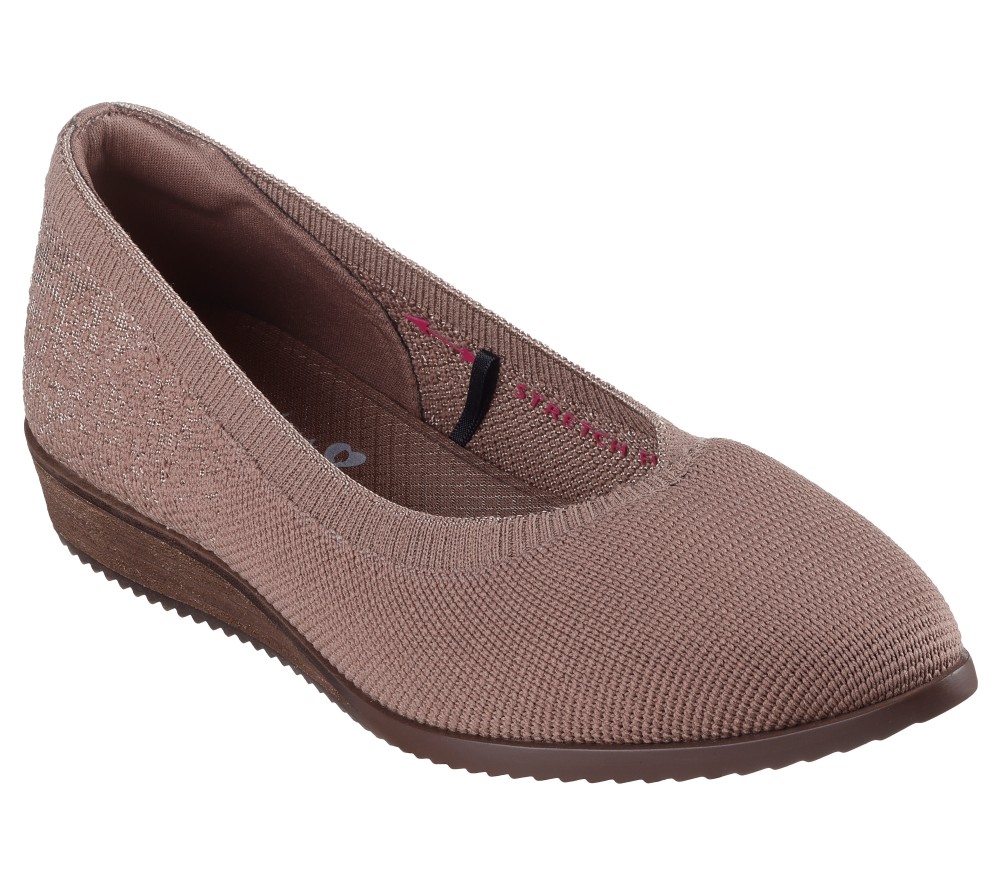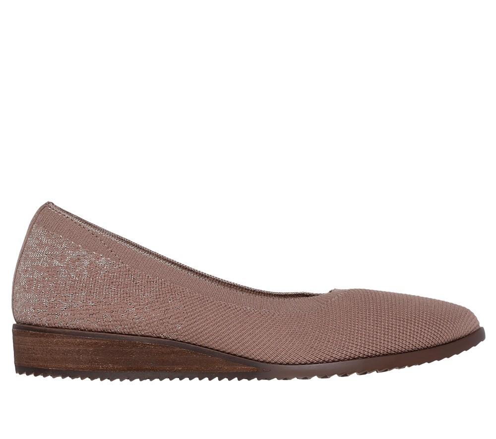 Flexible traction outsole. 1 1/4-inch wedge heel. Designed with recycled materials, this skimmer features a Stretch Fit® knitted upper with a cushioned Skechers Air-Cooled Memory Foam® insole and a low wedge heel. Our Planet Matters®: Good for your feet. Good for the world. These are Flats made by Skechers.
