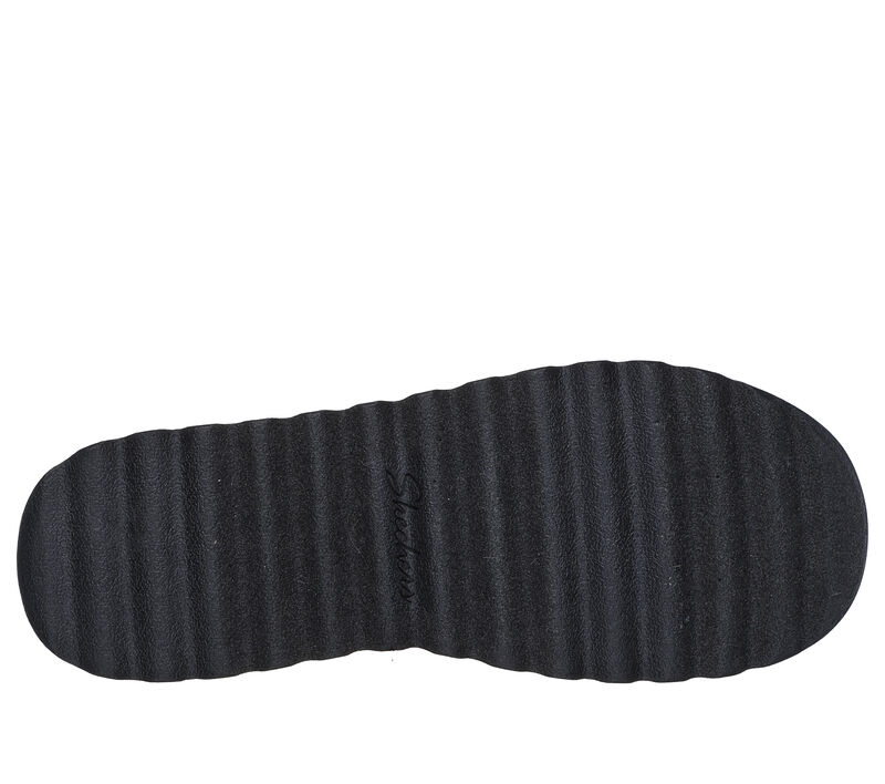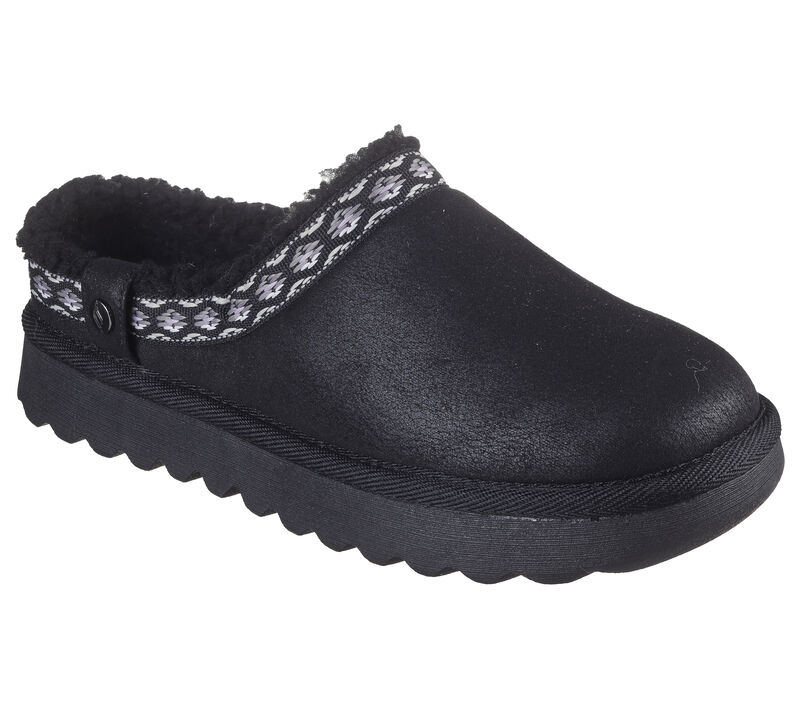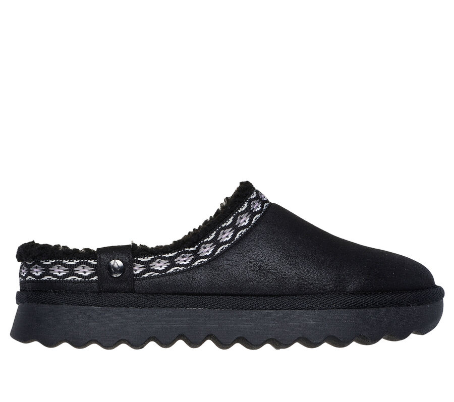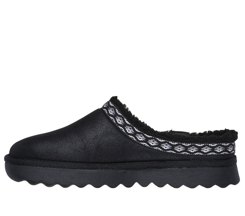 Skechers Memory Foam cushioned comfort footbed. This Skechers casual open-back clog features a vegan leather upper with a geo pattern collar trim, faux-fur trim and lining, plus a cushioned Skechers Memory Foam™ footbed. These are Slippers made by Skechers.