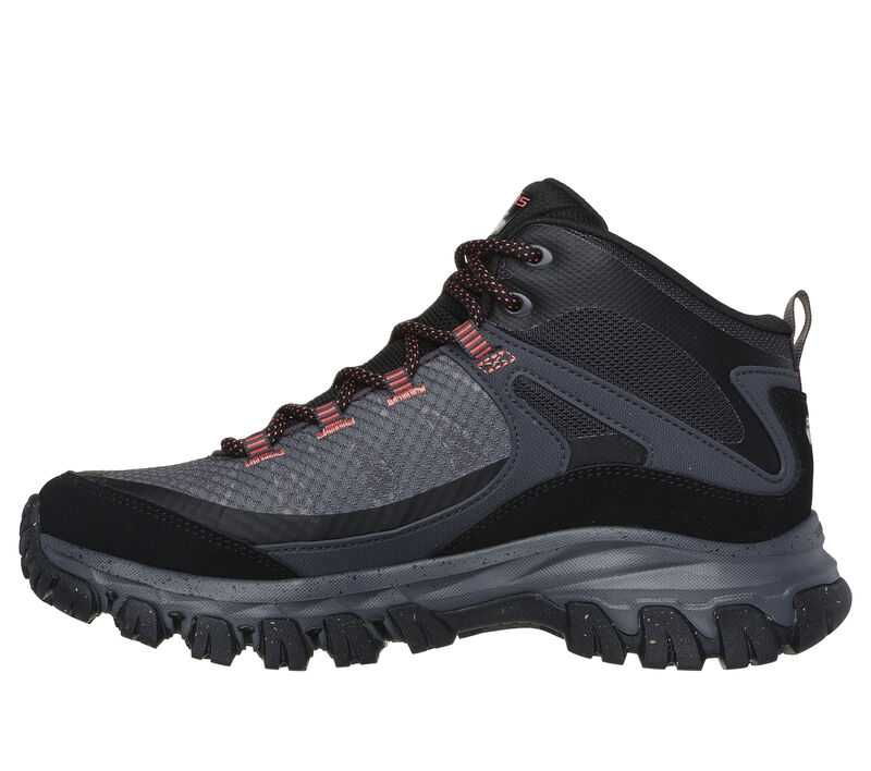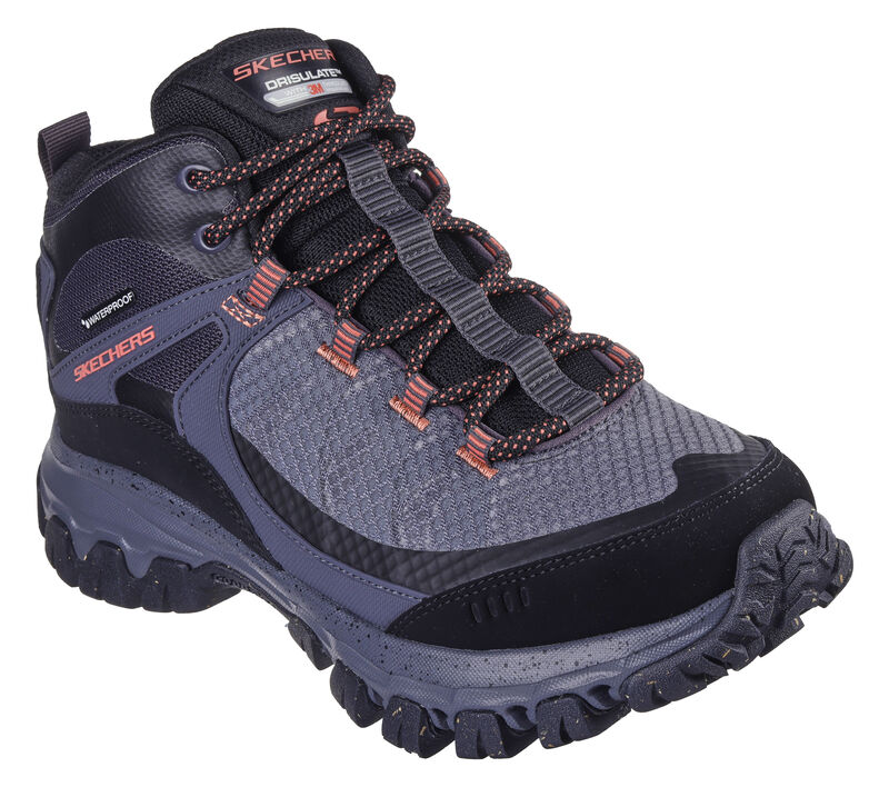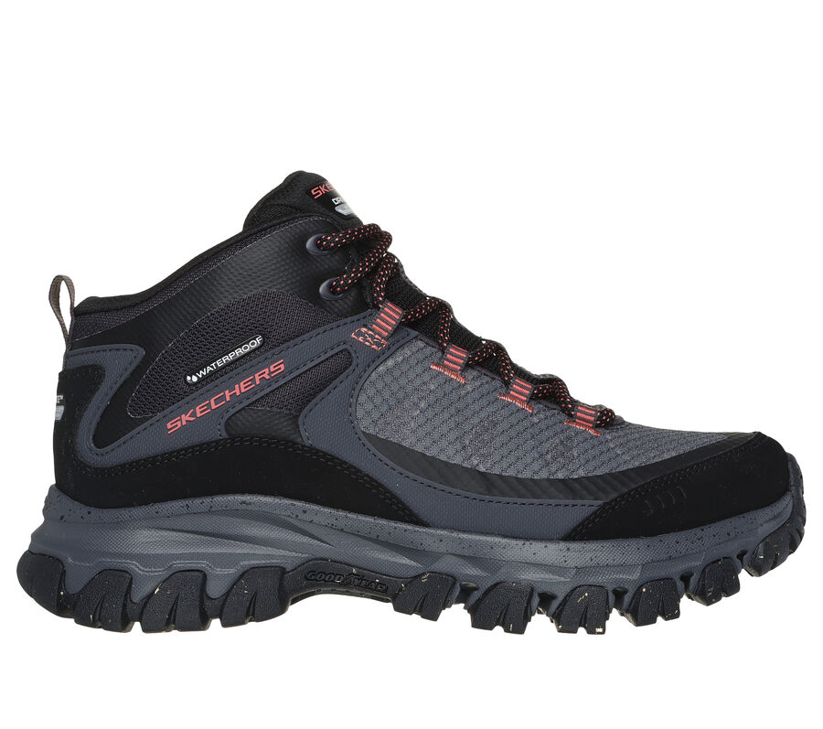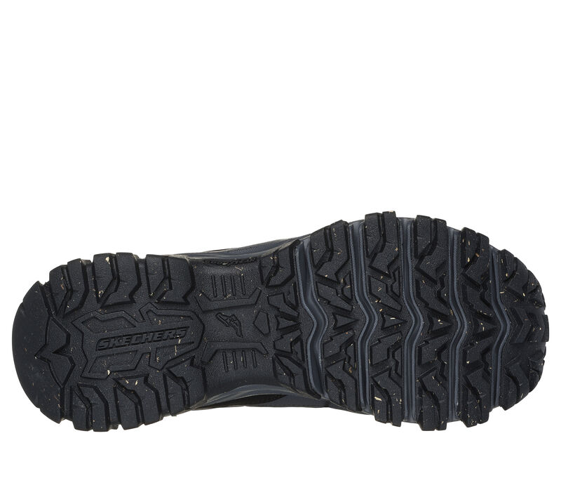 Outdoor trail hiker mid-top design. This Skechers anti-slip outdoor trail design features a lace-up waterproof leather, mesh and synthetic upper with 200g 3M™ Thinsulate™ lining for added warmth, Skechers Air-Cooled Memory Foam® insole and a reclaimed rubber outsole combined with Goodyear® Rubber Techonolgy. Skechers Air-Cooled Memory Foam® cushioned comfort insole. These are Waterproof Shoes made by Skechers.