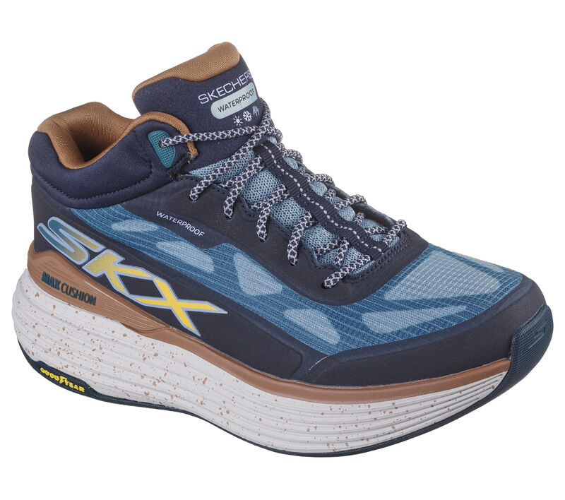 This Skechers 100% waterproof performance mid-top features a mono mesh upper with round laces, a Skechers Air-Cooled Goga Mat™ insole, Skechers Max Cushioning® platform midsole, plus a Goodyear® Anti-slip Rubber Outsole. Skechers Air-Cooled Goga Mat ™ breathable insole with high-rebound cushioning. Skechers Max Cushioning® design for exceptional comfort and support. Anti-slip Goodyear® Rubber Outsole delivers enhanced traction, stability and durability. These are Waterproof Shoes made by Skechers.