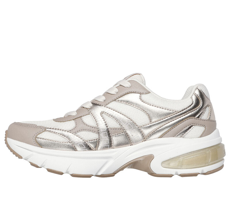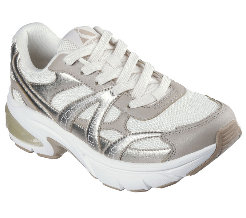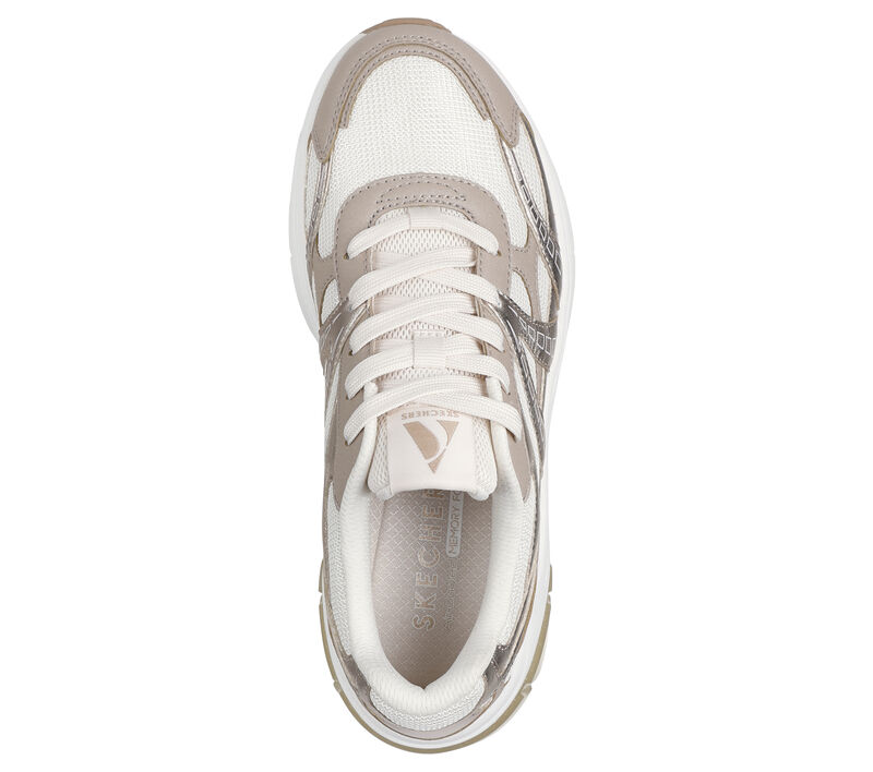 This Skechers shoe lace-up fashion sneaker features a metallic duraleather and mesh upper with a translucent midsole insert and cushioned Skechers Air-Cooled Memory Foam® insole. These are Skechers Lace Up made by Skechers.