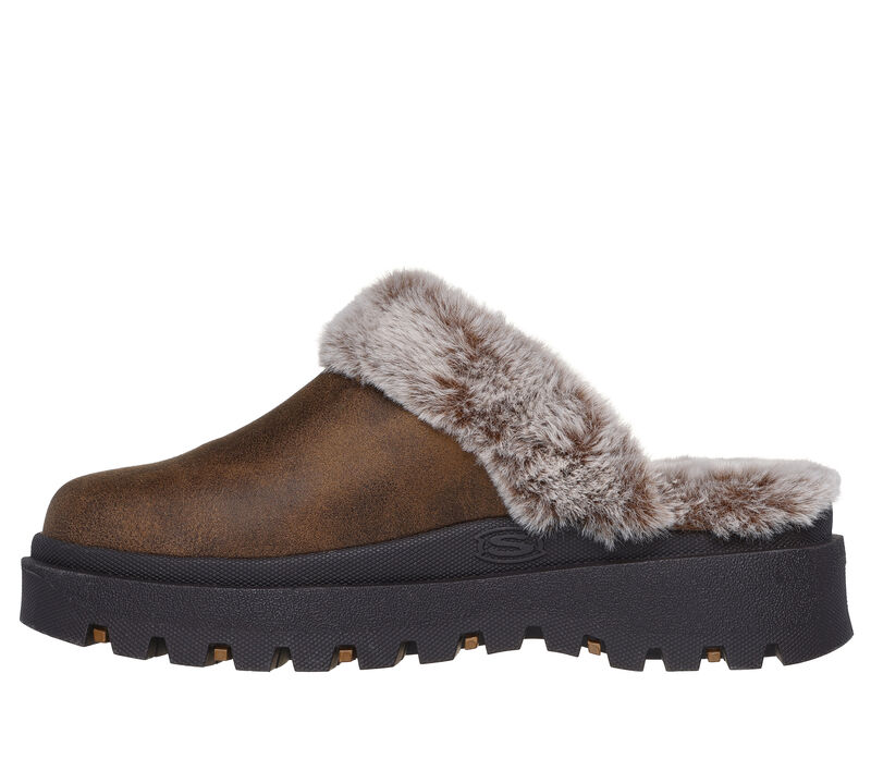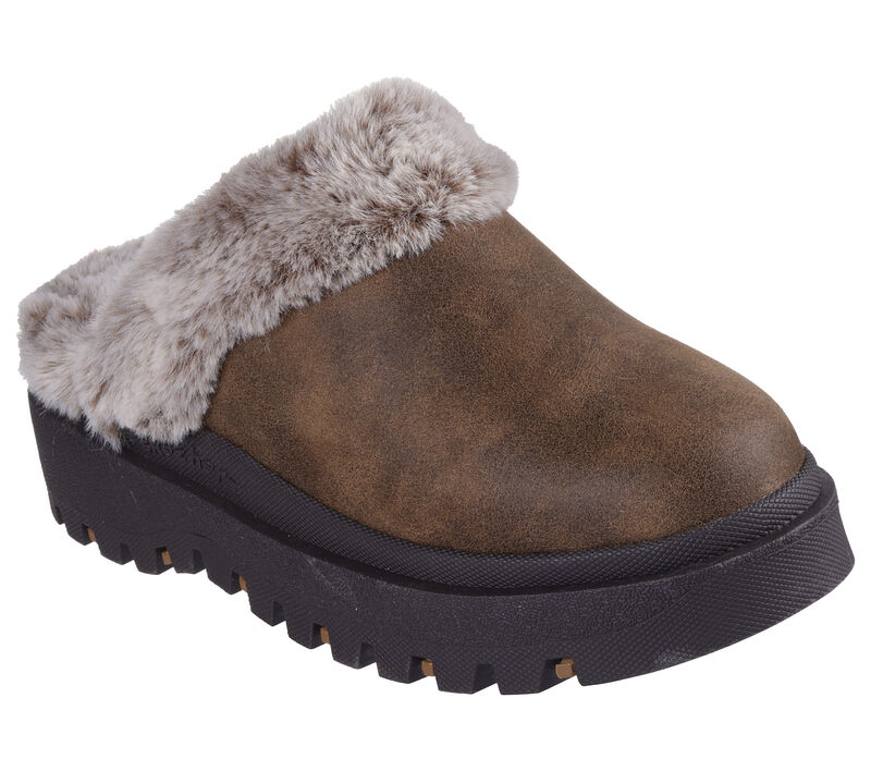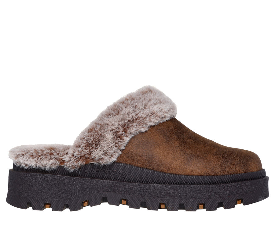 Crafted with 100% vegan materials. This vegan open-back clog design features a distressed leather-look textile upper with faux-fur trim and lining, platform midsole, and a cushioned Skechers Memory Foam™ insole. These are Slippers made by Skechers.