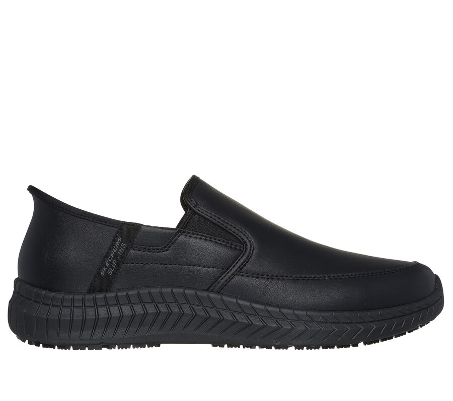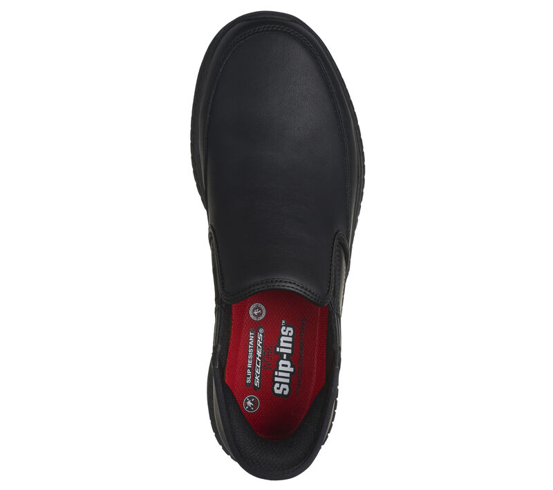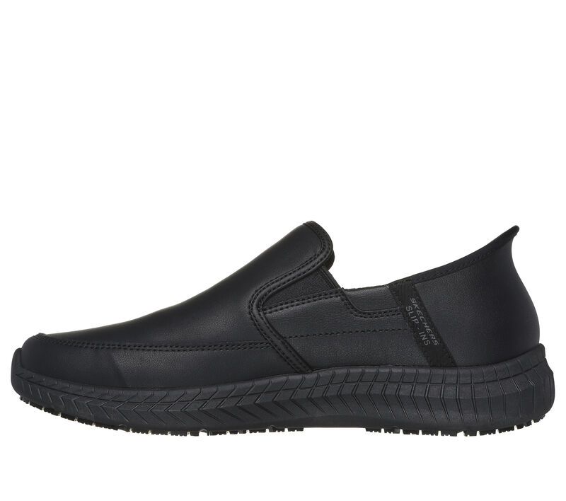 Designed with our exclusive Heel Pillow™, this Skechers shoe laceless slip-on features a smooth genuine leather upper with twin gore panels, a slip-resistant traction outsole, and an Air-Cooled Memory Foam® cushioned comfort insole. Step into effortless style and comfort with Skechers Hands Free Slip-ins™, designed with a unique Comfort Pillow™ in the heel. These are Work Shoes made by Skechers.