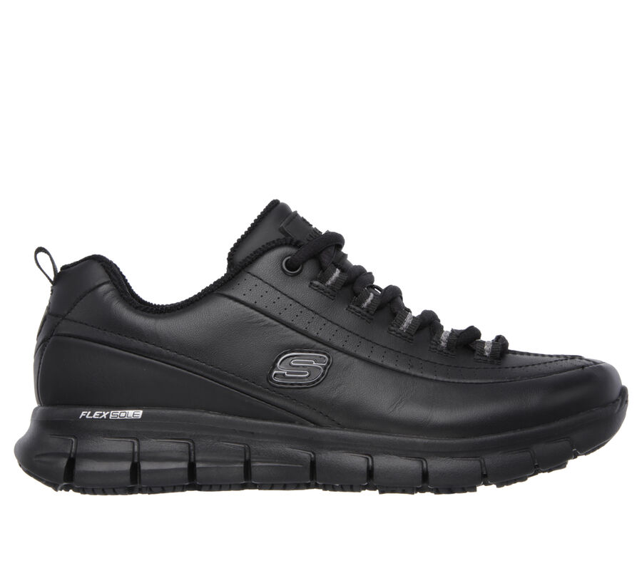 Skechers Memory Foam™ cushioned removable comfort insole. Featuring a smooth leather upper in a lace-up slip-resistant work design with a cushioned Skechers Memory Foam™ insole. Relaxed Fit® design for a roomy comfortable fit. These are Work Shoes made by Skechers.