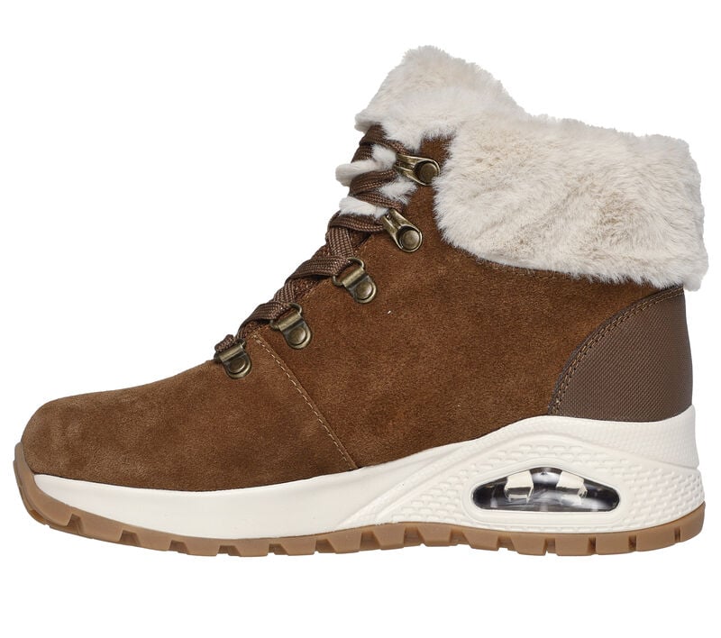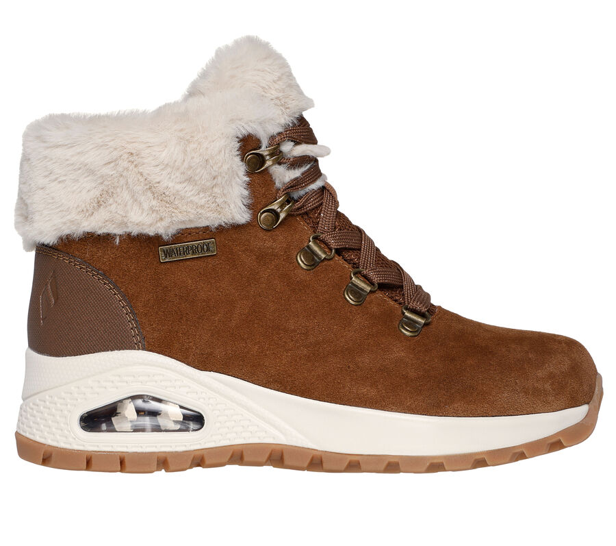 This Skechers Uno Rugged Moonlight Ridge lace-up fashion sneaker boot features a suede upper with faux-fur trim, a Skechers Air-Cooled Memory Foam® insole, and a Skech-Air® visible airbag midsole. Walking on clouds, everywhere you go. Flexible traction outsole. These are Waterproof Shoes made by Skechers.