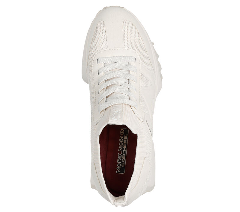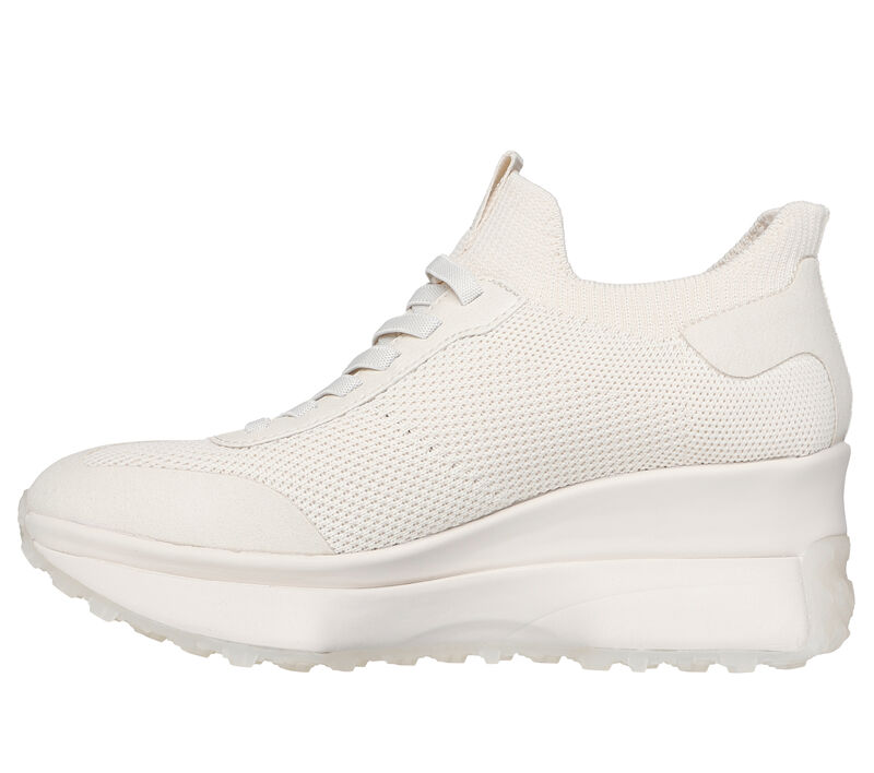 2 1/4-inch heel height. Vintage vibes meets modern comfort in Skechers Mark Nason Upper Cut Neo Wedge Juni.
