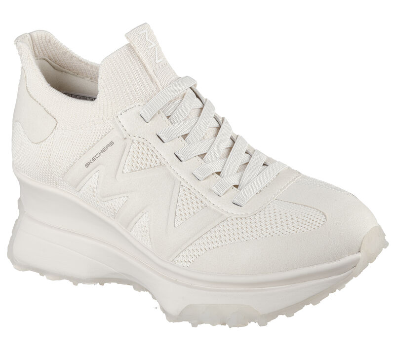This Skechers retro inspired wedge jogger features a knitted upper with stretch laces, a quarter panel MN logo and a cushioned Memory Foam Lux insole. These are Women’s Shoes made by Skechers.