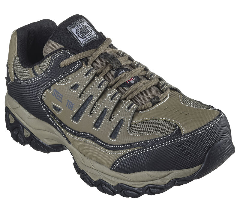 Skechers Work Shoe: Durable leather, synthetic and mesh fabric upper on a lace-up casual steel toe work design with stitching and overlay accents and cushioned Memory Foam insole. Durable high-abrasion textured leather upper. These are Work Shoes made by Skechers.